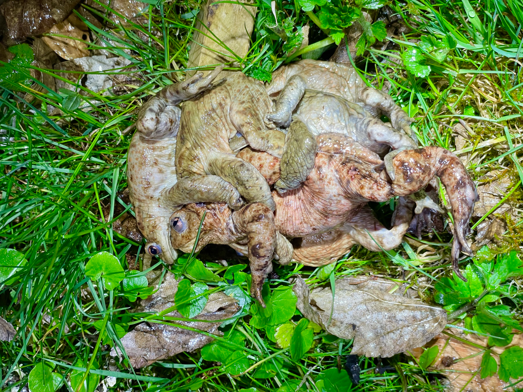 Weiteres Erdkrötenweibchen mit 5 Verehrern aus dem Wasser entnommen und von 4 Verehrern befreit. Das Weibchen war schon stark geschwächt und musste sich an Land erstmal von den "Angeboten" erholen.