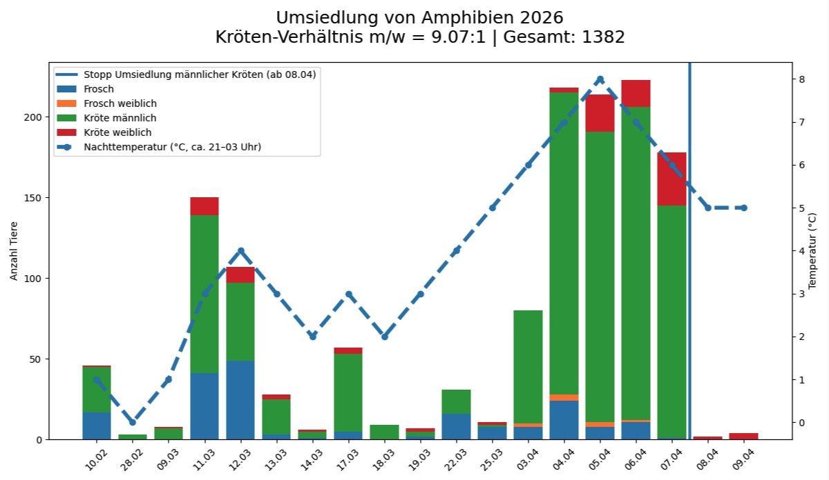Kröten- und Froschumsiedelung. Vom 10.2-10.4 insg. 1382 Tiere