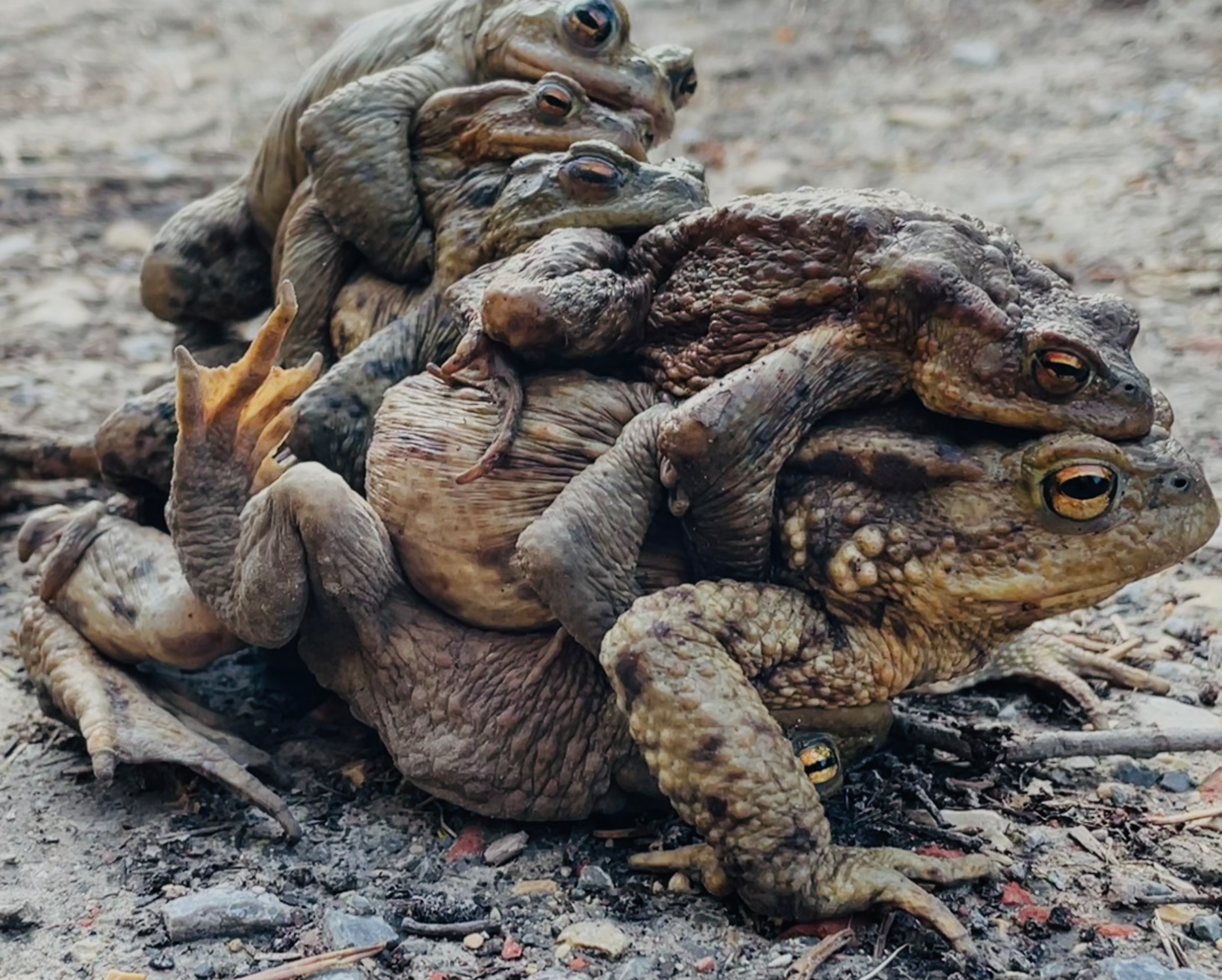 Erdkrötenweibchen mit 5 Verehrern auf dem Weg zum Teich